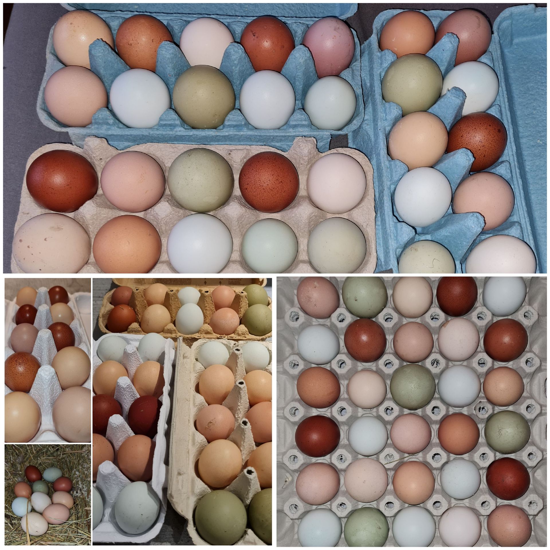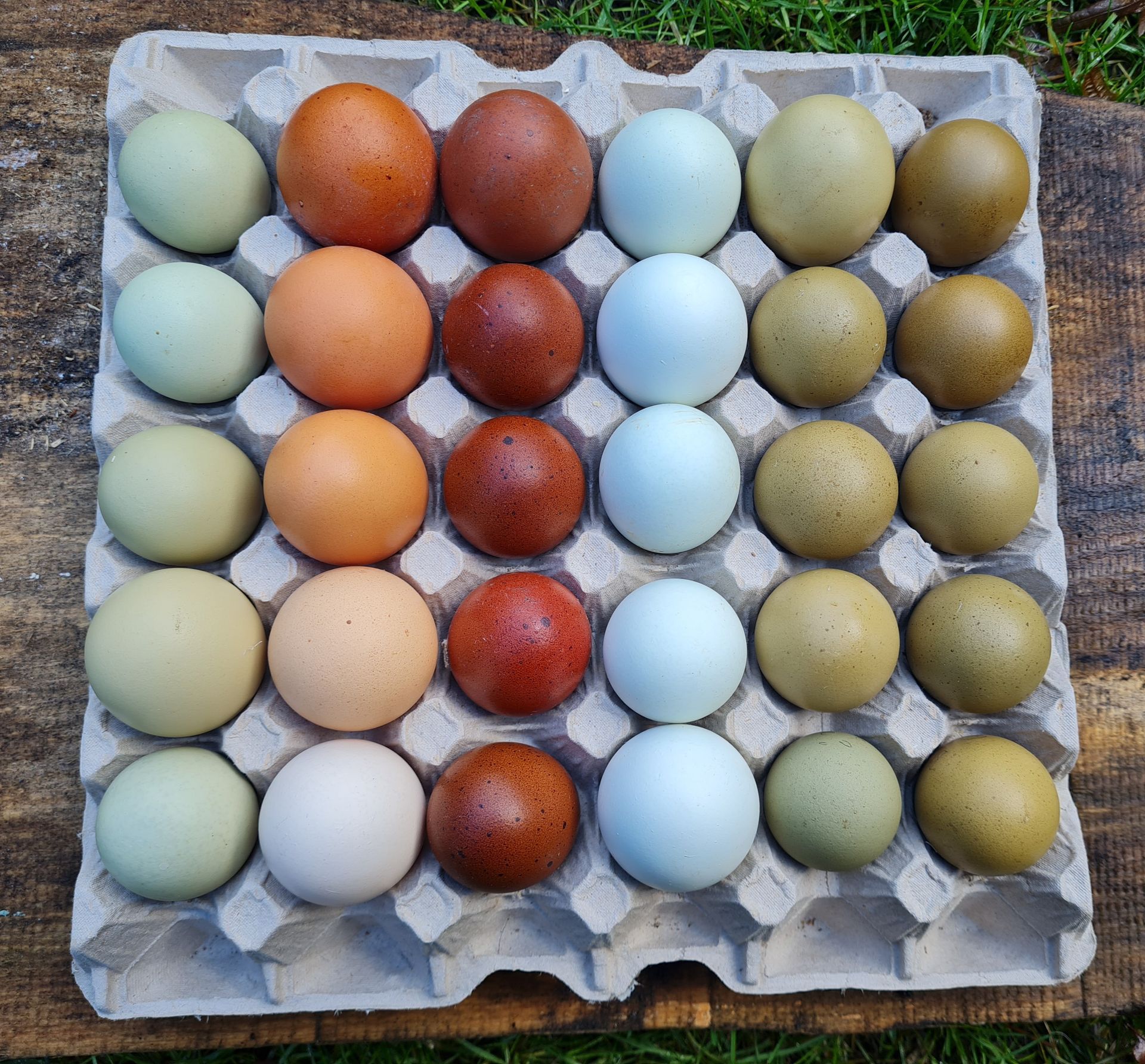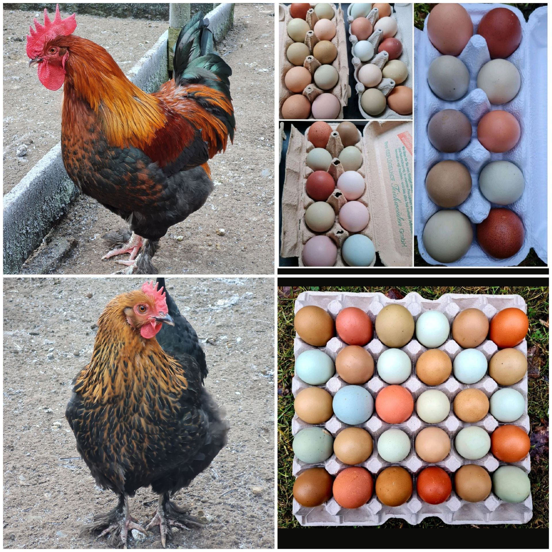 4.4. Die Nachkommen aus den bunten Bruteiern sind keine reinrassigen Kreuzungen aus verschiedenen Hühnerrassen. Erst durch diese Kreuzungsmethode ist die Farbvielfalt bei den Bruteiern möglich. Die weiblichen Nachkommen können, müssen aber nicht zwangsläufig die gleiche Eierfarbe wie die des Ausgangseies legen. Da es sich um Kreuzungsnachkommen handelt, hängt die Eierfarbe von den genetischen Einflüssen der Elterntiere ab. Durch unsere Kreuzungsmethode werden die weiblichen Nachkommen in der Regel blaue, grüne und olive Eierschalenfarben in den unterschiedlichen Farbvariationen legen. Weitere Farben sind immer mal möglich.